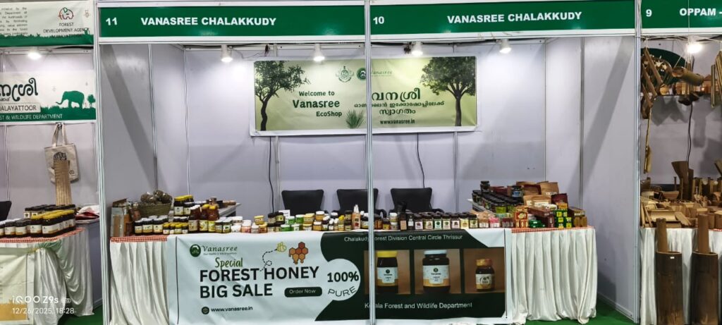 A major highlight of the event was the active participation of Vanasree – Chalakudy, operating under the Forest Development Agency of the Chalakudy Forest Division (Central Circle, Thrissur). Occupying Stalls 10 and 11, Vanasree offered visitors a direct link to the heart of Kerala’s forests. Their presence was more than just a retail space; it was a showcase of authenticity and community-driven sustainability.